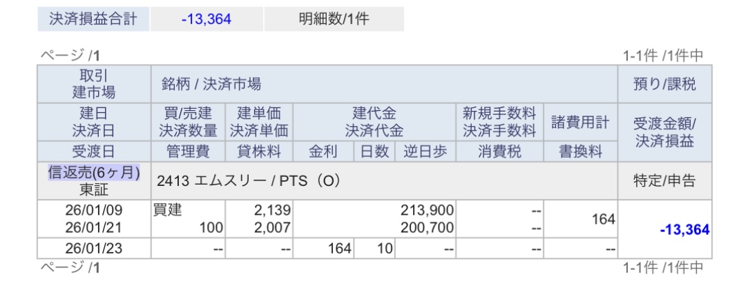 最終損益は -13,364円。