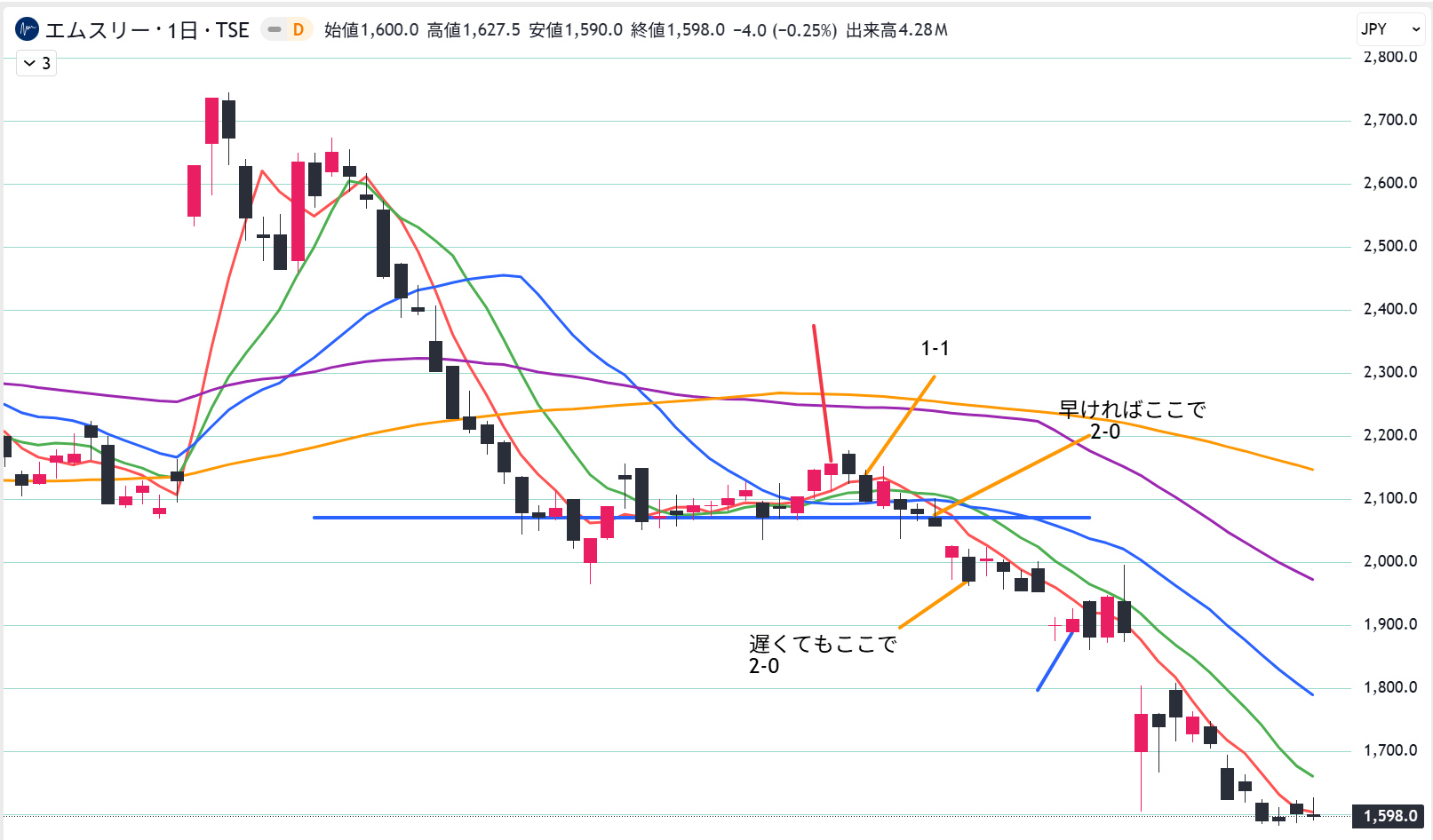 短期の動きだけを見て「下値は固まった」と思い込んでしまい、全体の流れを確認せずにエントリーしてしまいました。